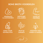Notre bouillon soutient les articulations, la peau, les os et surtout les intestins — le centre de votre système immunitaire. De nombreuses maladies commencent par un déséquilibre de la flore intestinale. Le bone broth aide à la réparation de la paroi intestinale et renforce votre résistance.