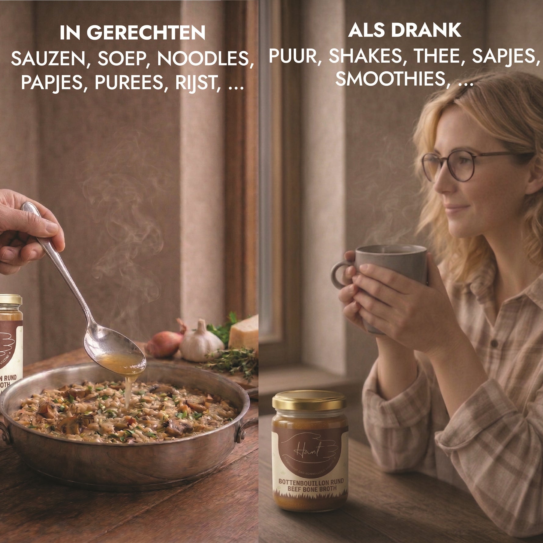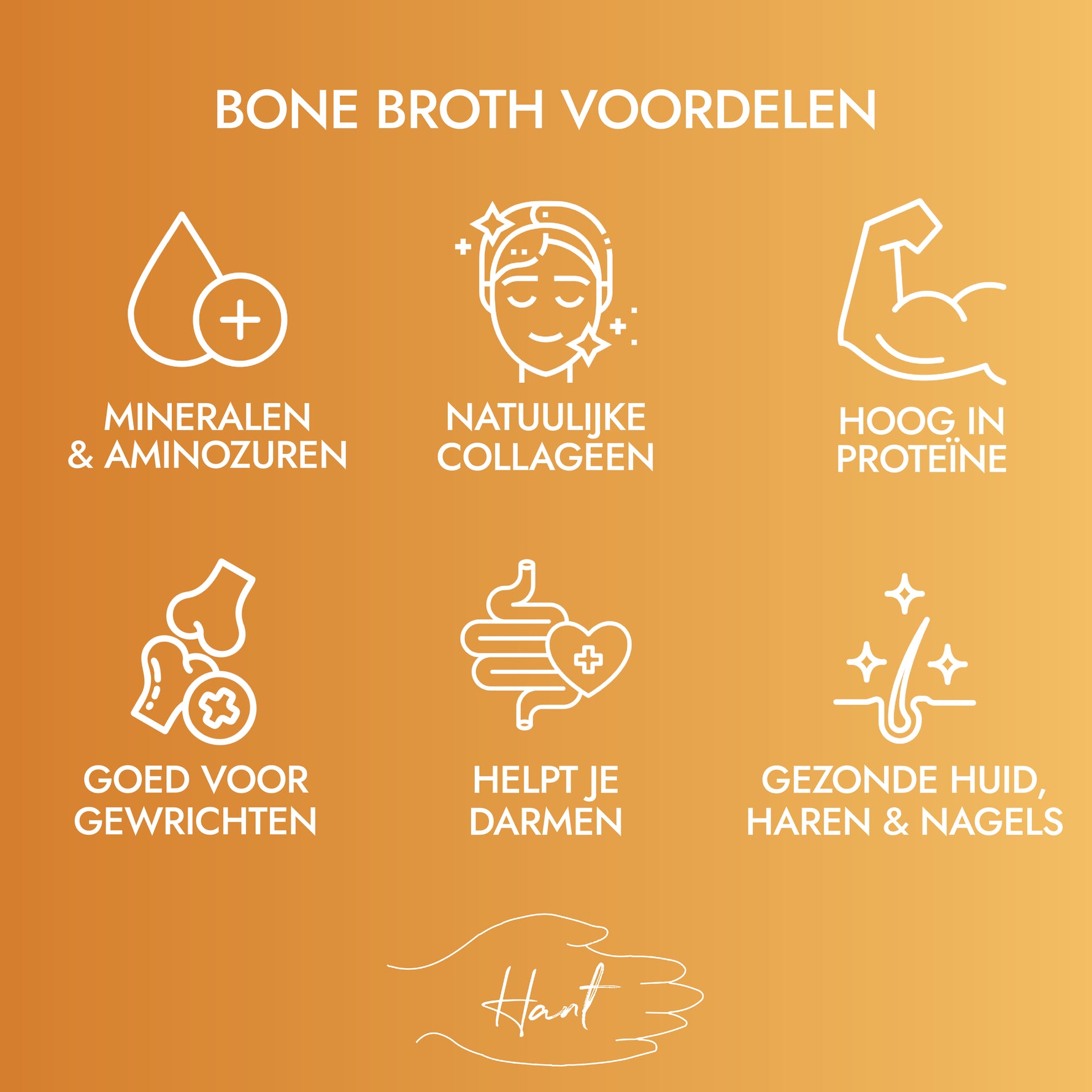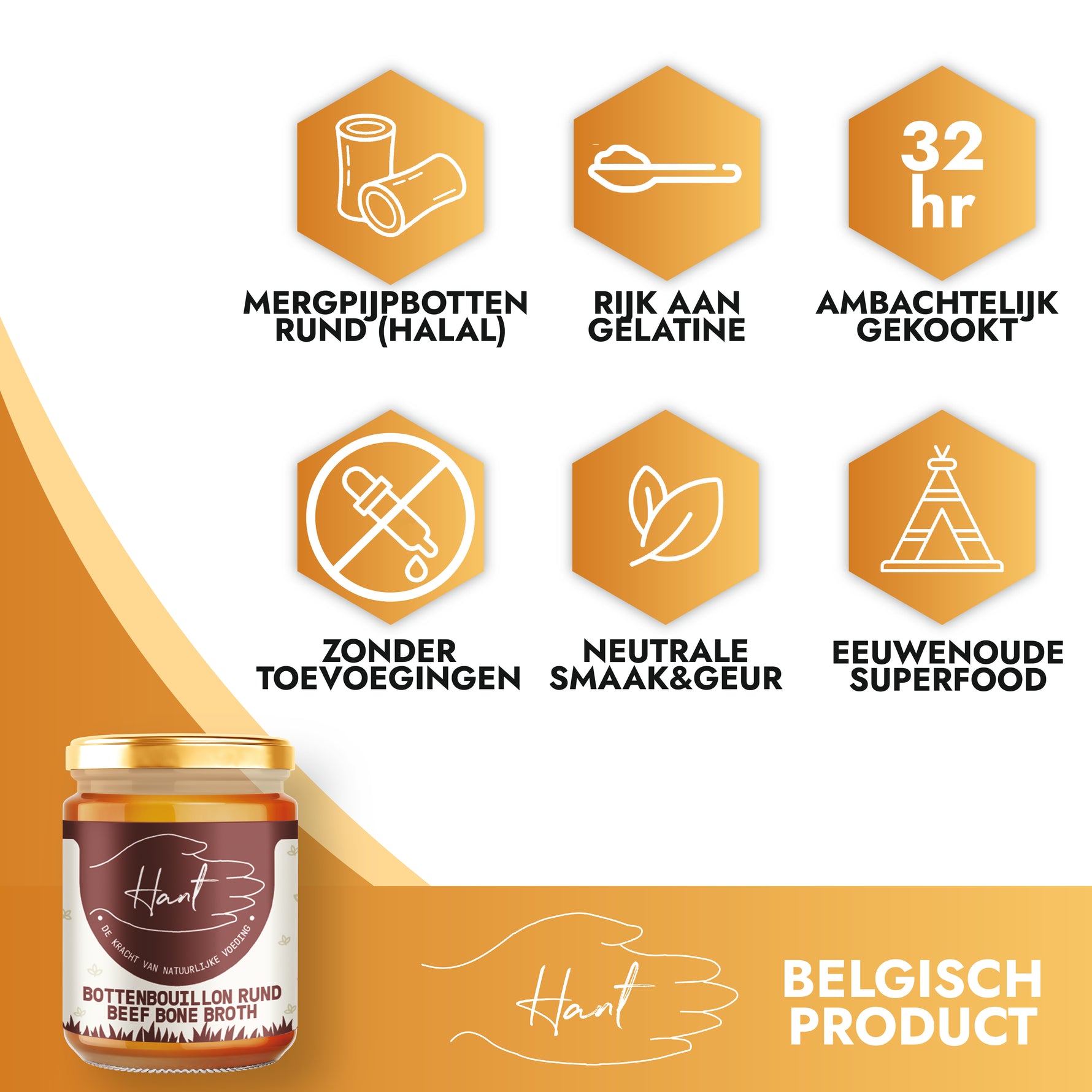 La puissance du bouillon d'os HANT – un bone broth concentré d'os de moelle de bœuf halal, mijoté lentement 32 heures pour un maximum de collagène et de nutriments. Cet élixir ancestral soutient les articulations, la peau, les intestins et la récupération quotidienne.