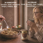 - Dans les plats : Ajoutez aux soupes, riz, shakes, bouillies, purées, ramen, pho, sauces, ... pour une valeur nutritionnelle supplémentaire